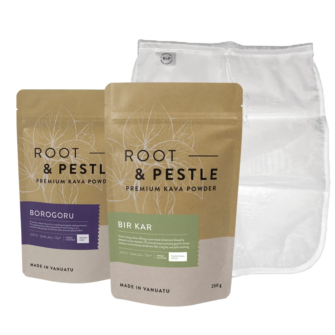 R&P traditional kava powder is the ground roots of premium kava plants; you still need to extract it yourself, which is easy but takes a bit of time. Many people enjoy the calming process of preparing it. It is silky-smooth to drink, and higher in DHK than our instant kava powders, which makes it ideal for calm chill-out sessions. Because the plant material is entirely strained out of the drink (if prepared properly), there is very little fibre to digest but there is also a little bit less bioavailability of the kavalactones. In other words, you’ll never get 100% of each of the compounds which give you that beautiful buzz out of the powder and into your shell, so there will always be a portion of “the goods” left behind. If you’re serving a group, traditional kava powder is perfect, and just needs a gentle swirl or a mild stir before each serving.